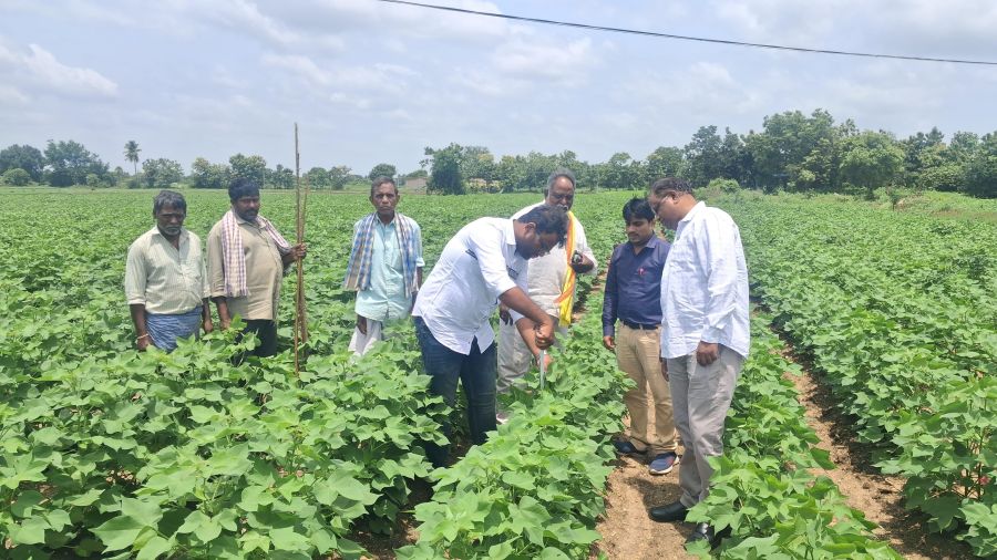 Kvk Mamnoor conducted a monitoring visit on the HDPS special cotton project at Konkapaka village, Mandal Parvathagiri, Warangal district, on 28.07.2025, and verified 7 farmers' fields of 14 acres of area of Rasi seeds variety RCH 929. During the visit, collected biometric observations such as Plant height (55cm), Spacing(90cmx15cm), No. of Monopodial branches (2), and Sympodial branches (8) & No. of squares (14) were recorded. Demonstration conducted on Plant growth regulator spraying (Mepiquat Chloride 5%) on HDPS cotton field at the age of 45 DAS to control the vegetative growth and promote the ball formation. In this visit Dr.N.Rajanna (Programme coordinator & Head), Dr. A. Raju ( SMS - Plant protection), R. Harsha Reddy (YP-II), and N. Sai Chand (YP-1), Cotton special project (ICAR-CICR) were participated.